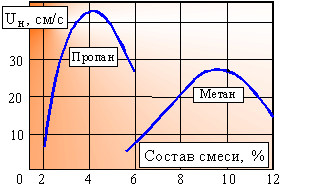 Дефлаграционный взрыв - это быстрое горение (быстрый пожар) газовоздушной смеси, концентрация горючего в которой находится между нижним и верхним концентрационными пределами воспламенения, т.е. смеси, подготовленной к горению. На рис.1 приведены зависимости скорости нормального горения от концентрации горючего в смеси. Приведены данные по пропану и метану, т.к. в бытовых целях используются именно эти вещества.