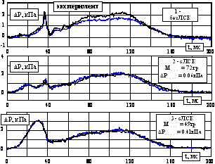 Для подтверждения корректности описанной вычислительной схемы было проведено сравнение результатов расчета с экспериментальными данными (рис.7). Полученное удовлетворительное согласие между результатами расчета и эксперимента позволяет говорить о применимости расчетной схемы для прогнозирования взрывных нагрузок на объектах, где в качестве предохранительных конструкций используются ЛСК.