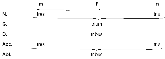 tres, tria три изменяется как прилагательное двух окончаний и имеет только формы мн. числа: