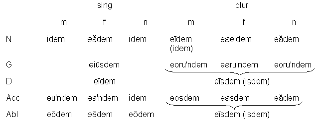 У местоимения idem, eadem, idem склоняется первая часть; конечная часть -dem прибавляется без изменений. В G. sing. местоимения idem, eadem, idem, а также is, ea, id и hic, haec, hoc -i- попадает в положение между гласными (т.е. в начало слога), и поэтому читается как [й]: eius [эйус] и т.д.