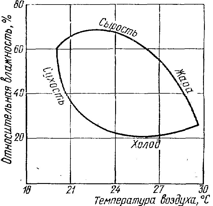 При изменении влажности и температуры воздуха теплоотдача с поверхности тела человека будет неодинаковой. При этом потребность организма в теплоотдаче бывает неодинаковой и зависит от интенсивности нагрева тела человека в связи с разной интенсивностью работы и теплоизлучений от посторонних источников тепла, а также от влажности окружающей среды. Определенное соотношение перечисленных факторов должно создавать условия комфорта, т. е. обеспечивать такие соотношения температуры, влажности и скорости движения воздуха, при которых человек затрачивает минимум энергии для терморегуляции организма и имеет минимальную нагрузку на сердечно-сосудистую систему. Это обеспечивает постоянную температуру тела человека при разных условиях окружающей среды.