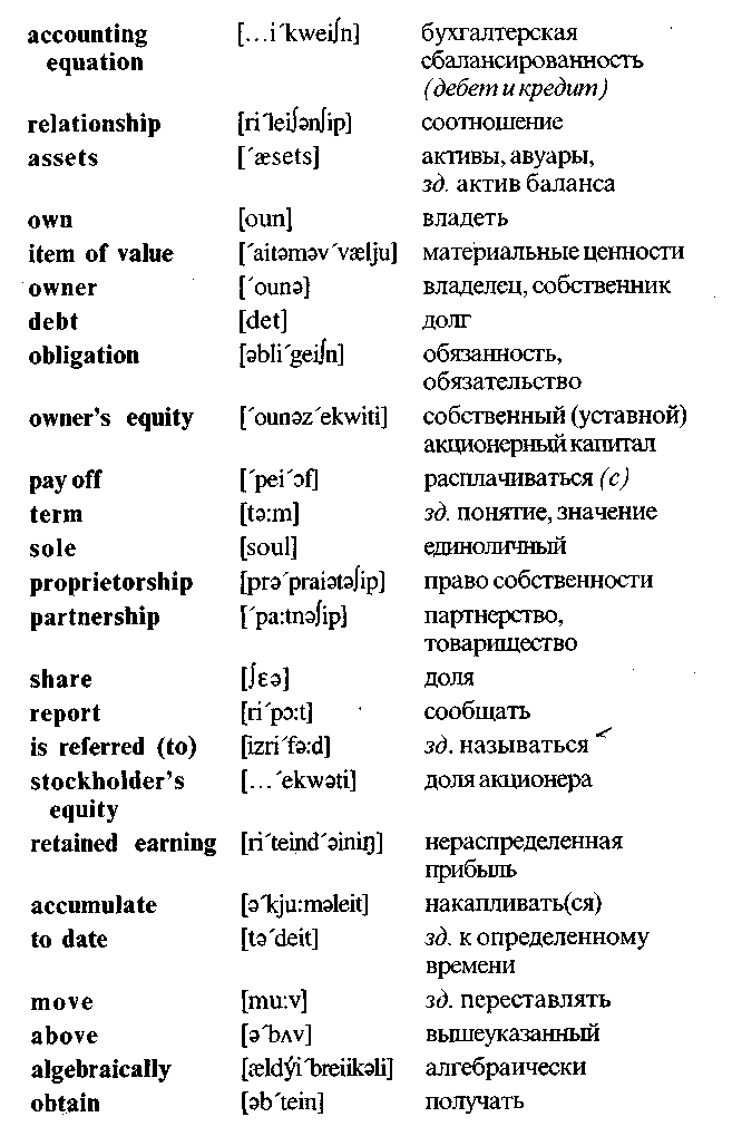 6. Согласно (according to) бухучетному уравнению активы равны пассивам (денежным обязательствам) плюс собственный акционерный капитал.