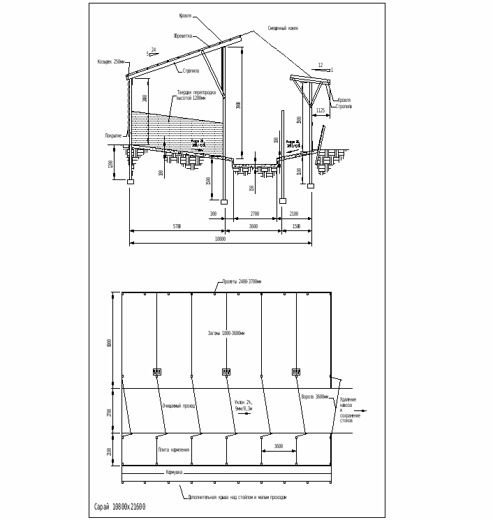 Сараи перемещения обычно имеют наклонную односкатную крышу без изоляции, с уклоном 3:12. Сараи должны быть открытыми с юга или востока для освещения преимущественно солнечным светом. Козырек на обратной стене открыт. Это обеспечивает регулировку уровня влажности зимой. В летний период года для естественной вентиляции с задней стены, верхней ее части устраняют ткань или другие покрытия. Расширьте оба края сарая на 1200 мм вне фасадов загона, чтобы уменьшить ветровой эффект в углах сарая в течение холодного периода года. Расположите поилки на одной линии с кормушками, чтобы уменьшить количество разбрызгиваемой воды в области отдыха.