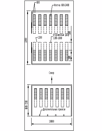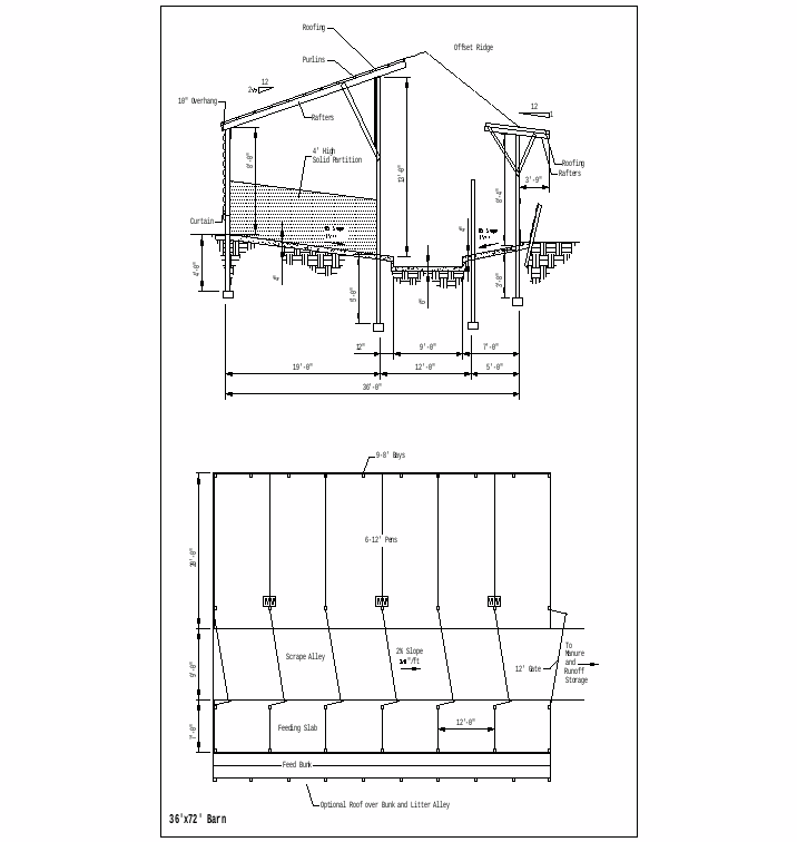 Образец сарая для 72-90 животных с внешним кормлением и очищаемым каналом для навоза.