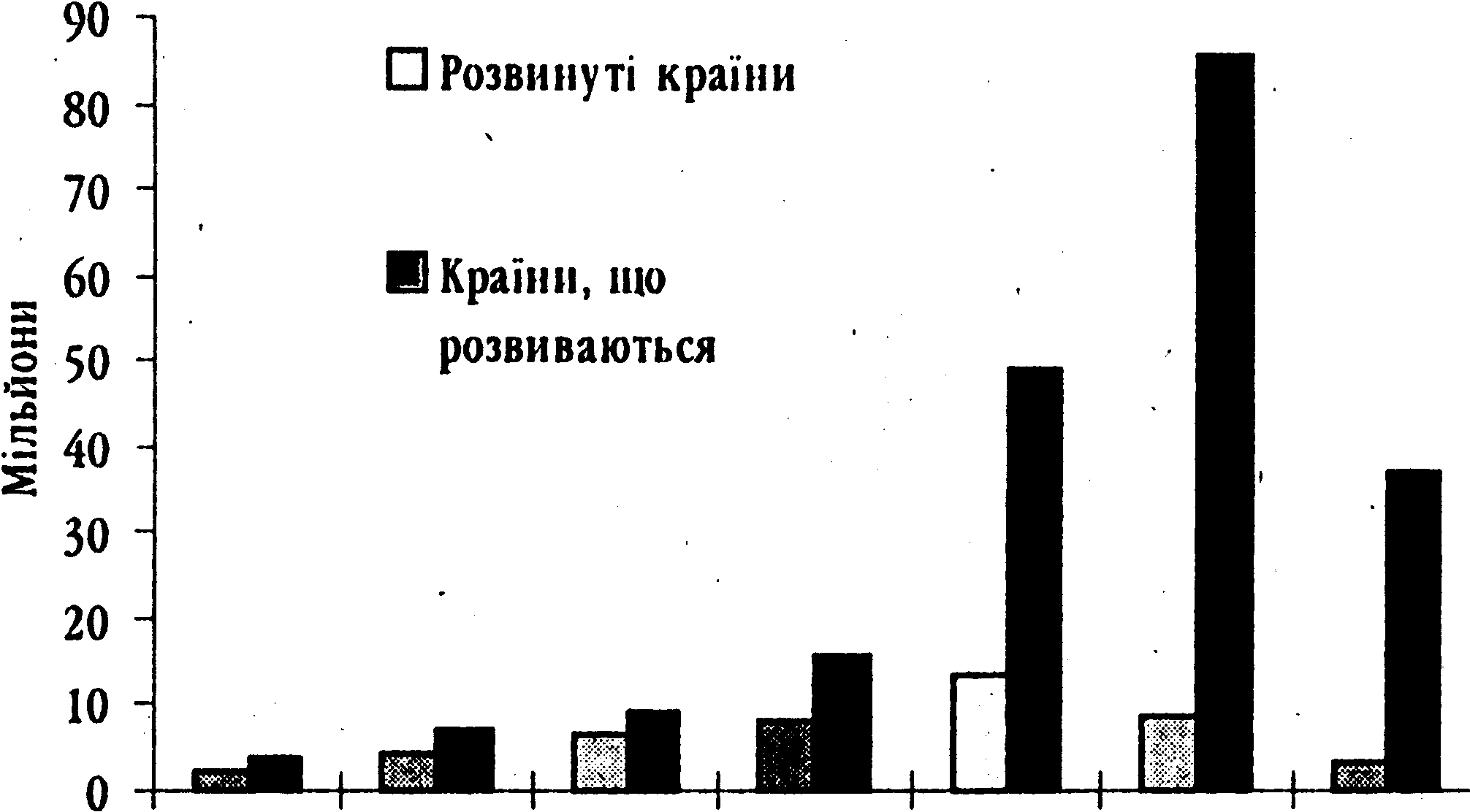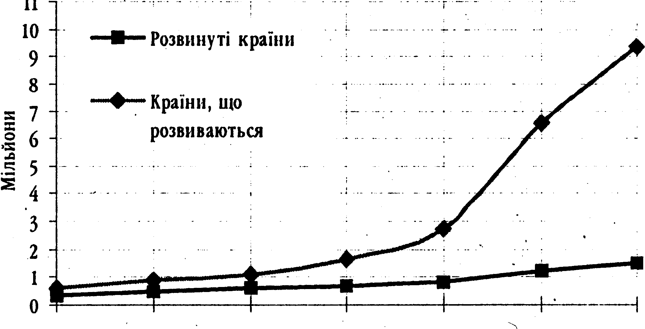 Наприкінці 1999 року чисельність населення планети сягнула 6 млрд.чол., а у першій половині XXI ст., за передбаченням футурологів, наблизиться до 11 млрд. осіб (табл.1, рис.1).