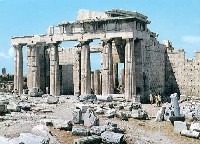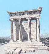 Чотири великих творів стоять і понині там на горбі зі скелястими схилами. Широка зигзагоподібна дорога веде від підніжжя гори до єдиного входу. Це Пропілеї монументальні ворота з колонами в доричному стилі з широкими сходами. Їх спорудив архітектор Мнесікл у 437-432 роках до н.е. Але перш ніж зайти у ці величні ворота, кожен поневолі оглядається в право. Там, на високому п’єдесталі бастіону, що колись охороняв вхід у Акрополь, велечіє храм богині перемоги Ніки Аптерос, – Безкрилій Перемозі, що прикрашена іонічними колонами. (Ніка – крилата діва ототожнює перемогу, - рахувалась одним з атрибутів Афіни; тут афіняни побажали зобразити її безкрилою, щоб вона не змогла полетіти з міста). Це справа рук архітектора Каллікрата (друга половина 5 ст. до н.е.). Храм – легкий, повітряний, надзвичайно прекрасний – виділяється своєю білизною на синьому фоні неба. Храм Ніке стоїть на виступі скали. Він ледь повернутий в сторону Пропілей і грає роль маяка для процесій, огинаючих скелю.