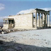 Наближуючись до головного святилища, колона глядачів проходила навкруг Ерехтейона – другого храму що стоїть ближче до північного схилу вершини. Ерехтейон будувався пізніше, вже в останній чверті 5 століття до н.е., але згідно з загальним задумом і плануванням. По контрасту з простим і строгим Парфеноном Ерехтейон виглядає майже дивним. Кожний з чотирьох його фасадів оформлений по різному. На західному фасаді шість тонких, струнких іонічних півколом що стоять на високому цоколі. Північний портик видається вперед, що видно в профіль одночасно з західним. Його колони стоять на високому цоколі. разом з західним, що стоять прямо на землі. Довга південна стіна храму, гладенька складена з маленьких квадратів служить фоном для маленького зсунутого до заходу, портика каріатид, де роль колон виконують жіночі фігури. Східний фасад – портик звичайного типу з колонами на трьохступінчатому постаменті. Таким чином, різні типи рішення іонійського портика об’єднувались в Ерехтейоні в дуже своєобразне ціле. По мірі обходу учасники бачили Ерехтейон в різних аспектах. То вони бачили чіткі обертання колон на фоні неба, то колони ніби входили в стіну що перетворювались на жінок, то на місці сквозних колонад виникала спокійна гладь стіни, яка вела до нової ритмічно розділеній колонами композиції східного входу.