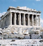 Парфенон – головна і сама більша споруда Акрополя присвячена Афіні Парфенос – Афіні Діві. Історія зберегла імена цих зодчих – Іктин і Каллікрат, вони збудували Парфенон в 447-438 р. до н.е. Весь з світлого мармуру, в оточенні сорока шести дорійських колон, Парфенон дійсно являється втіленням незайманої чистоти і строгості. Від Пропілей він видний з кута, так що зразу сприймається не фасадне, а як об’ємне пластичне ціле; видно дві його сторони – коротка, увінчана фронтоном з скульптурами що зображували спор Посейдона і Афіни, і довга, що йшла по діагоналі, що манила глядачів до східного входу в храм, де знаходився вівтар Афіни. Процесія рухалась вздовж довгої стіни Парфенона і скрізь його колонаду бачила таку ж процесію на рельєфі фризу, там також скакали вершники, йшли дівчата, що несли дари. Цей фриз, як і фронтони і статуї, як всі скульптурні прикраси Акрополя виконувався по задуму Фідія ним самим і його учнями. Північний портик Ерехтейона вів у святилище Афіни, де зберігалася священна статуя богині, що ніби то впала з неба. Двері з святилища відкривалося в маленький дворик, де росло єдине у всьому Акрополі священне оливкове дерево, яке піднялося, коли Афіна доторкнулась в цьому місці своїм списом Через східний портик можна було попасти в святилище Посейдона, де він ударив по скелі своїм тризубцем, залишивши борозни з дзюрчачою водою. Тут же знаходилося святилище Ерехтея, що шанували нарівні з Посейдоном. Центральна частина храма – прямокутне приміщення ( 4,1 на 13,1метрів). У храмі також знаходилась могила і святилище першого легендарного царя Аттіки Кекропа.