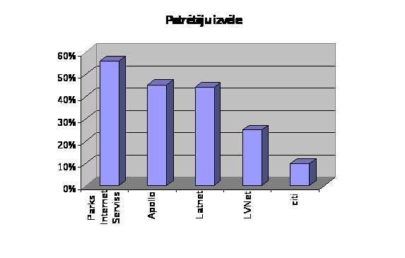 “Data Serviss” aptaujas rezultâtâ ir noskaidrotas populârâskâs Interneta pakalpojumu sniedzçju kompânijas. Pirmo vietu ieòem Parks Ineternet Serviss - 56% aptaujâto izvçlçtos tieði ðî provaidera pieslçgumu, vispâr Parks minçts 63% gadîjumu (6,5 % respondentu noteikti neizvçlçtos Parka pakalpojumus), otrie ir pçdçjâ laikâ daudz reklamçtie Apollo ar 45,4% izvçïu un 59% minçðanas bieþumu. Kâ treðâ populârâkâ kompânija atzîta Latnet, kuras servisu izvçlçtos 44,5%, kopçjais minçðanas bieþums - 53%. No minçtajiem gigantiem krietni atpaliek (taèu ieòem stabilu vietu ðajâ tirgû) LV Net ar attiecîgi 25% un 30% izvçlçm, zem 10% robeþas atrodas tâdas kompânijas kâ BKC, Telia, Neonet, Binet un citi vçl mazâk vai vairâk pazîstami provaideri. Jâpiebilst, ka pçdçjâ kategorijâ ietilpstoðo kompâniju pakalpojumus respondenti drîzâk neizvçlçtos nekâ izvçlçtos.