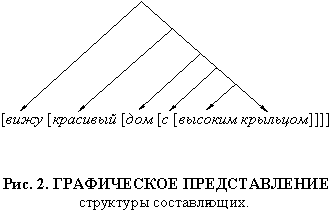 Другой способ синтаксического анализа заключается в последовательном разделении предложения на все более мелкие единицы, состоящие из наиболее тесно связанных между собой слов. Такие грамматически слитные отрезки называются составляющими. Структура составляющих может быть изображена, например, с помощью скобок: вижу красивый дом с высоким крыльцом. С помощью скобок обозначен тот факт, что все предложение в целом, а также такие его части, как дом с высоким крыльцом, с высоким крыльцом, высоким крыльцом, являются составляющими.