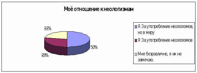 Выполнив исследовательскую работу, мне удалось очень многое узнать о неологизмах, их происхождении и употреблении в современном русском языке. Анализ газет: «Аргументы и факты», «Комсомольская правда», «Мир Новостей», «Зеленый проспект», помог в составлении своего мини-словаря неологизмов. Проведённый мною опрос среди 18 одноклассников показал, что мнения о неологизмах разные, даже среди небольшого количества людей, но никто из современных тинэйджеров не против неологизмов (примеры см. «Приложение» п.1 стр.14). Также собранные данные помогли составить процентное соотношение мнений (см. «Приложение» п. 2 стр.15). Я считаю это увлечение очень полезным. Ведь велика роль собирателей слов. Среди таких героев-ревнителей русского слова на первом месте стоит Владимир Иванович Даль, посвятивший всю свою сознательную жизнь сбору народных и иностранных слов, выражений, их систематизации и составлению толкового словаря.