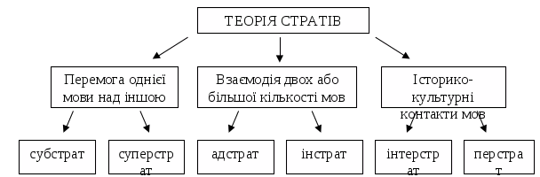 6. Найбільш послідовним прихильником теорії Г.І. Асколі на початку ХХ ст. був П.Г. Гойданич, якому належить розробка критерію “фонетичного синтезу”, що передбачає дію фонетичних законів під час сприйняття та переходу на чужинну мову. Фонетичний синтез є частиною лінгвістичного синтезу, метою якого є складання уявлення про характер мови та визначення в ній гомогенних та гетерогенних явищ. У 30-і рр. ХХ ст. на противагу субстрату було запропоновано нові терміни – суперстрат (В. фон Вартбург) та адстрат (М. Фалькхоф). При визначенні різних за часом мовних нашарувань слушним є розрізнення субстрату та субсубстрату (К. Мерло). У 60-і рр. ХХ ст. в експлікації наслідків мовних контактів дослідники виділили ще три можливі типи мовних нашарувань: інтерстрат (М.І. Занд), інстрат, або інтрострат (М.О. Бородіна) та метастрат (А. Ронкалья, Д. Сільвестрі), або перстрат (В. Фенкер). Ці поняття виявляють безперечну типологічну близькість і можуть бути розглянуті як варіанти одного й того самого лінгвістичного феномена, що фіксує перехід від однієї мови до іншої за певних історичних обставин. В. О. Виноградов визначив типологію субстрату за спорідненістю: таутогенний, ізогенний, аліагенний. О. К. Матвєєв виділив квазісубстратні явища.