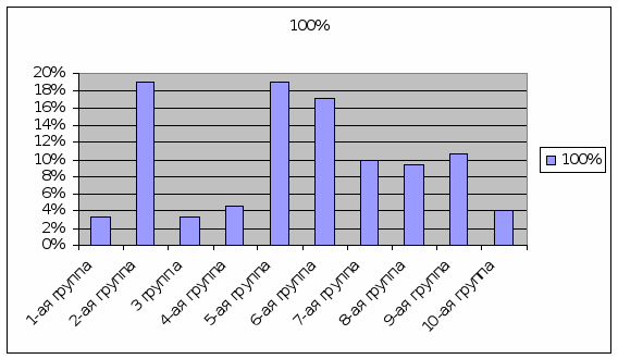 Проведя распределение названий спортивных товаров по группам, мы подсчитали общее количество, их получилось 124 наименования, и выделили процентную часть каждой группы.