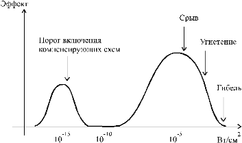 Похожие зависимости наблюдаются и при воздействии сверхвысокочастотных излучений (СВЧ-излучений). Так, на кривой зависимости величины физиологического эффекта от плотности мощности облучения, наблюдаются два максимума (рис. 2). Эти максимумы также разделены "мертвой зоной", наличие которой объясняется как результат включения в работу активных барьерных механизмов и компенсирующих систем организма. Когда эти силы перестают справляться, наблюдается тотальное возбуждение, завершающееся срывом и гибелью организма.