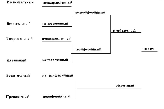 Описание шести падежей достигается с помощью трех предложенных ученым семантических признаков: направленности, объемности и периферийности. Признак направленности присущ винительному и дательному падежам, значение которых всегда предполагает указание действия на объект (писать письмо, подарить товарищу и т. п.), тогда как для остальных падежей этот признак необязателен. Признак объемности указывает на границы обозначаемого предмета, подчеркивает, что объем содержания предмета, выражаемый, в частности, родительным падежом, меньше общего объема обозначаемого предмета (ср.: кусок хлеба, стакан чаю и т. п.). Другое свойство объемности заключается в невозможности падежа указывать на отсутствие предмета и характерно для предложного падежа. Семантический признак периферийности присущ дательному и творительному падежам, поскольку суть этого признака заключается в дополнительной неглавной информации, выражаемой им. Описание системы русского падежа может быть представлено в виде схемы (рис. 1). Экономность, компактность и наглядность описания предмета исследования с помощью компонентов (признаков) достигается за счет того, что их число меньше числа описываемых явлений (в приведенном примере тремя признаками непротиворечиво и исчерпывающе описывается шесть грамматических явлений).2