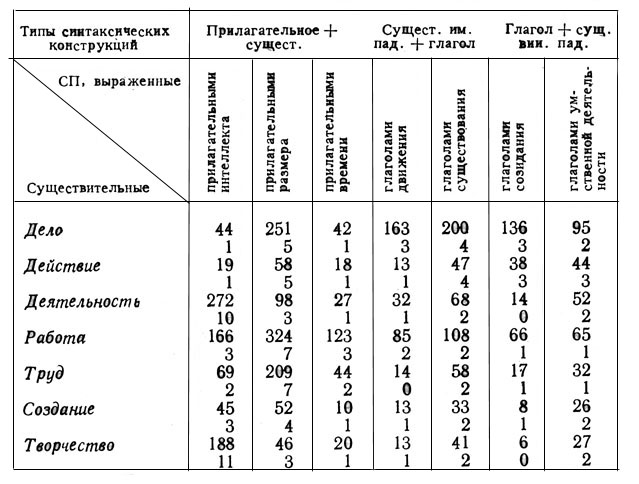 Ниже представлен фрагмент таблицы, в которой показаны несколько семантических признаков, полученных в результате исследования сочетаемости слов дело, действие, деятельность, работа, труд, создание, творчество в текстах на русском литературном языке объемом свыше пяти миллионов словоупотреблений. Верхний ряд цифр против каждого слова обозначает частотность зарегистрированных в обследованных текстах словоупотреблений, сочетающихся с заданным словом и обладающих указанным в верхней части таблицы семантическим признаком (типа СП 2). Нижний ряд цифр обозначает доли в процентах этих частот (с точностью до целых) по отношению ко всей сумме словоупотреблений, сочетающихся с данным существительным. Сопоставление значений рассматриваемых существительных удобнее и нагляднее осуществлять по нижним цифрам, поскольку ими определяется та количественная доля, которая приходится на семантический признак в значении конкретного существительного. 4