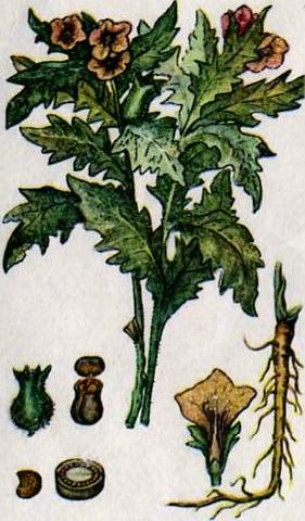Ботаническая характеристика: двулетнее травянистое растение с одиночным ветвистым бороздчатым стеблем, клейким от железистых серозеленых волосков. Корень стержневой. В первый год растение образует розетку из прикорневых крупных яйцевидных или продолговатых листьев. На втором году вырастает стебель высотой 20 – 115 см. Стеблевые листья продолговато-яйцевидные, выямчато-перисто-надрезанные, мягкие, покрытые клейкими беловатыми железистыми волосками, с неприятным одурманивающим запахом. Прицветные листья продолговатые, почти цельные. Цветки довольно крупные, сидячие, находятся на верхушке стебля или в развилках в основании листьев. Чашечки длиной в 10 – 20 мм, трубчато-колокольчатые, в основании густо покрытые волосками. Венчик длиной в 20 – 45 мм с 5 лопастевидными лепестками. Окраска его кремово-желтая с темно-фиолетовыми прожилками и пятнами. Тычинок 5, из них 3 более длинные. Плод – кувшинчатая двухгнездная коробочка длиной 21 – 32 мм, открывающаяся наверху крышечкой, заключенная в отвердевшую чашечку с растопыренными наверху зубцами. Семена мелкоячеистые, буровато-сероватого цвета, круглые или слегка почковидные, сплюснутые, длиной около 1,5 мм. Вес 1000 семян 0,5 – 0,9 г. Цветет со второй половины мая до августа, плодоносит в июне – августе.