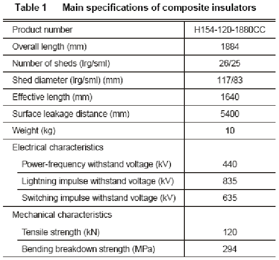 An important feature of the composite insulators developed here is that the design of the shed configuration is extremely free, owing to the use of silicone rubber for the housing. Based on past experience, IEC 60815 "Guide for the selection of insulators in respect of polluted conditions" was adopted. Electrical and mechanical characteristics were designed to satisfy the requirements set forth in IEC 61109 "Composite insulators for a.c. overhead lines with a nominal voltage greater than 1000 V: Definitions, test methods and acceptance criteria".