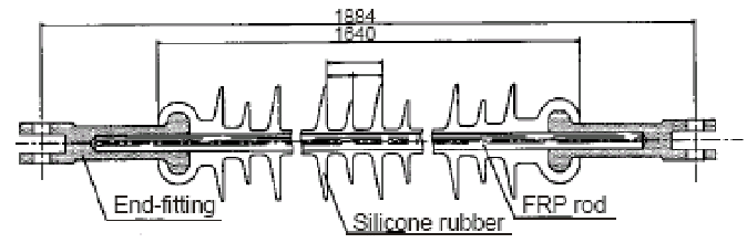 The end-fittings comprise three elements, and have the greatest effect on insulator reliability. Specifically the penetration of moisture at this point raises the danger of brittle fracturing of the FRP and the electrical field becomes stronger. For this reason the hardware is of field relaxing structure and the silicone rubber of the housing is extended to the end-fitting to form a hermetic seal. The end-fitting is connected to the FRP core by a compression method that maintains long-term mechanical characteristics.