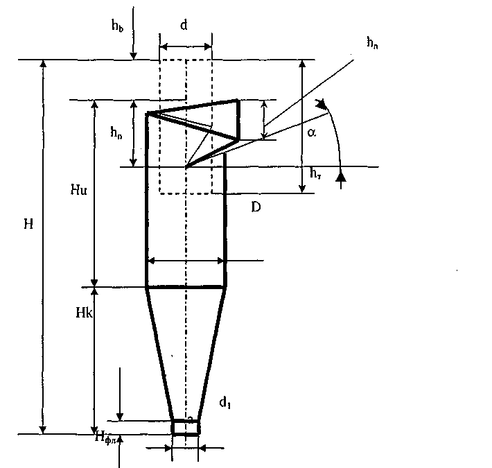 Область циклонного процесса, или зона улавливания пыли, расположена между концом выхлопной трубы и пылеотводящим отверстием циклона. Часть этой зоны занимает корпусный патрубок. В нем оканчивается циклонный вихрь, В цилиндрическом циклоне (Без корпусного патрубка) циклонный вихрь опирается на пылевой слой в бункере аппарата. При этом частицы вторично уносятся из бункера, т.е. происходит явление, аналогичное действию атмосферных вихрей на предметы, находящиеся на поверхности земли. Вторичный унос частиц возникает и тогда, когда выбран чрезмерно большой угол конусности нижнего патрубка циклона.