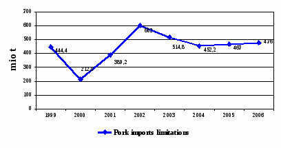 Government of Russia tries to create conditions in which Russian producers can develop. In particular, since 2003 imports of meat in the country are limited. In 2006 the pork import is limited to 476 thousand t. Major pork importers are Brazil, Denmark, USA. Share of chilled meat in the imports is inconsiderable, 90% of the pork is frozen.