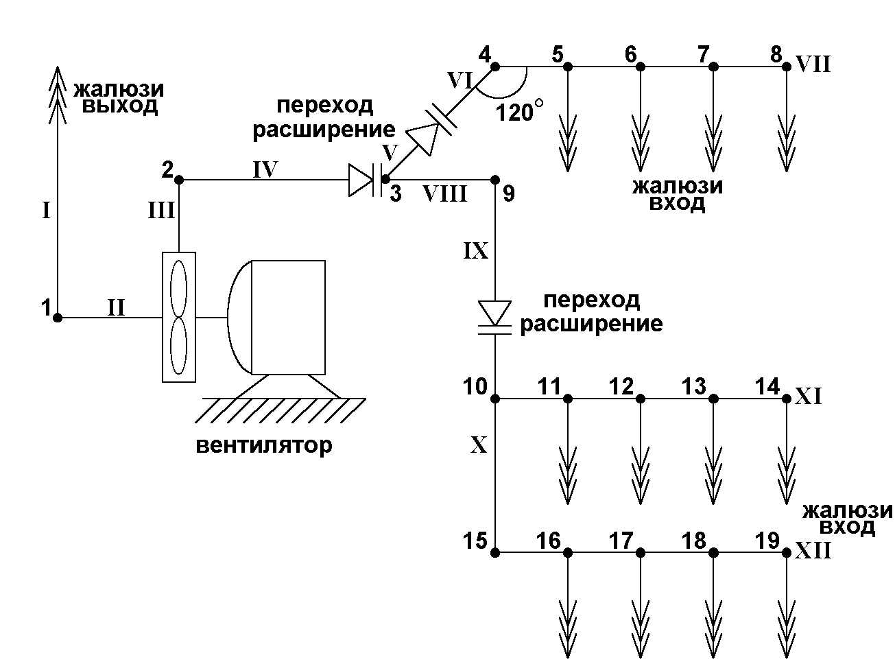 2. Длину прямолинейных участков l>Т>>i> и диаметр труб воздуховодов d>Т>>j> считаем заданными, [м]: l>Т>>I> = 4, l>Т>>II> = 2, l>Т>>III> = 1, l>Т>>IV> = 5, l>Т>>V> = 4, l>Т>>VI> = 3, l>Т>>VII> = l>Т>>XI> = l>Т>>XII> = 15, l>Т>>VIII> = 3, l>Т>>IX> = 5, l>Т>>X> = 10; d>Т>>I> = d>Т>>II> = d>Т>>III> = d>Т>>IV> = 0,5, d>Т>>V> = d>Т>>VIII> = d>Т>>IX> = 0,3, d>Т>>VI> = d>Т>>VII> = d>Т>>X> = d>Т>>XI> = d>Т>>XII> = 0,15.