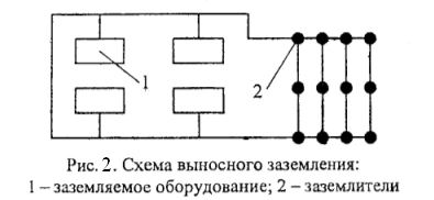 Выносное заземление оборудования показано на рис.2. При выносной системе заземления заземлители располагаются на некотором удалении от заземляемого оборудования. Поэтому заземленное оборудование находится вне поля растекания тока и человек, касаясь его, окажется под полным напряжением относительно земли