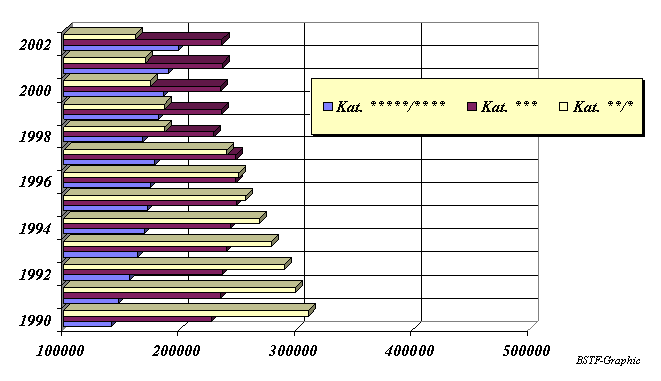 Another important statistical indicator is the number of arrivals: In 2002 they amounted to 27,36 million (resulting in a plus of 1.7% compared to 2001 or approximately 465,882 more than the previous year). The guests stayed an average period of 4.27 days, which resulted in a 26.6% occupancy rate of guest beds.