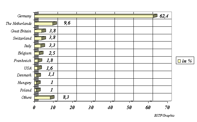 Traditionally, the vast majority of tourists come from Germany - in 2002 they accounted for approx. 53,52 million overnight-stays (around 62.4% of the total and +/- 2% var.):