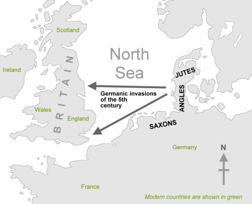 Племена Англів, Саксів та Ютів перетнули Північне море з боку Північної Германії та Данії і облаштувалися у Великобританії. Як пишуть історики: "Англійська мова прибула у Великобританію на кінці меча".