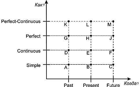 Основное из этих различий в английском языке заключается в том, что если объективное время со всей очевидностью делится на прошедшее, настоящее и будущее, то для языкового времени характерно большое количество форм выражения. В английском языке три основных периода времени выражаются разными формами глагола простой (Indefinite), длительной (Continuous), перфектной (Perfect), перфектно-длительной (Perfect Continuous).