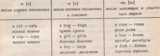 Основным способом образования множественного числа имен существительных является прибавление окончания -s или -es к форме существительного в единственном числе.