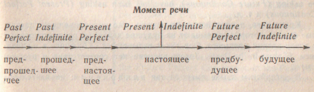 В пределах каждого грамматического времени в английском языке существуют формы, указывающие на время действия или состояния, обозначенного глаголом. Таких форм шесть. Если их расположить в хронологическом порядке от прошлого к будущему, то это следующие формы: Past Perfect (прошедшее перфектное), которое можно рассматривать как предпрошедшее, Past Indefinite (прошедшее неопределенное) — прошедшее, Present Perfect (настоящее перфектное), которое является преднастоящим,Present Indefinite (настоящее неопределенное) — настоящее, Future Perfect (будущее перфектное) — предбудущее и Future Indefinite (будущее неопределенное) — будущее.