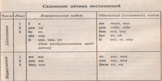 Личные местоимения имеют два падежа: именительный (the Nominative Case) и косвенный, или объектный (the Objective Case). Объектный падеж местоимений соответствует в русском языке различным косвенным падежам местоимений, например: те меня, мне и т. д.