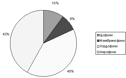 Дослідження назв музичних інструментів проводилося за групами стандартної класифікації Хорнбостеля-Закса, яка розподіляє музичні інструменти на чотири основні групи – ідофони, мембранофони, аерофони та хордофони. З використаних у нашій роботі одиниць до групи ідофони належать 5 слів (дзвін, трикутник, тарілки, кастаньєти, гонг), до групи мембранофони належать 4 слова (барабан, бубон, литаври, том-том), до групи аерофони належать 20 слів (саксофон, сопілка, трембіта, тромбон, труба, туба, орган, окарина, гобой, гармонь, валторна, гелікон, флейта, дудка, корнет, кларнет, баян, волинка, акордеон, фагот), до групи хордофони належать 19 слів (арфа, лютня, бандура, фортепіано, вібрафон, гусла, гітара, гавайська гітара, мандоліна, домра, віолончель, скрипка, альт, контрабас, балалайка, банджо, клавесин, торбан, ксилофон). Класифікацію відображено у діаграмі на рис. 1.1.