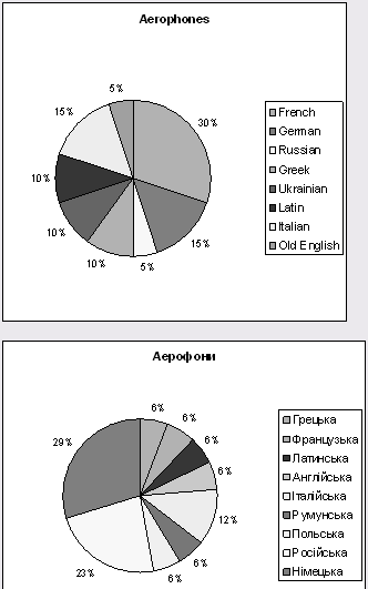 У підгрупі "Аерофони", яка є найбільш численною та охоплює 20 одиниць кількість запозичених назв в англійській мові становить 20 одиниць, питомої лексики не виявлено. Більшість запозичень з французької мови (trumpet, tuba, flute, cornet, clarinet, bassoon), достатньо велика кількість з німецької(accordion, fife, bagpipe) та італійської(trombone, ocarina, oboe) мов, незначна кількість походить з грецької(saxophone, helicon), української (sopilka, trembita), латинської (organ, harmonica), російської (bayan) та старої англійської (horn) мов. В українській мові кількість запозичених назв становить 17 одиниць, до питомої лексики належать 2 слова (сопілка, дудка), 1 слово (труба) не має загальноприйнятої етимології. Більшість запозичень належить до німецької мови (фагот, корнет, флейта, гобой, туба), значну групу становлять запозичення з російської (гармонь, баян, волинка, акордеон) та з італійської (окарина, тромбон), незначну кількість становлять запозичення з польської (валторна), румунської (трембіта), англійської (саксофон), грецької (гелікон) та французької (кларнет) мов. Результати аналізу демонструє рис 2.1.