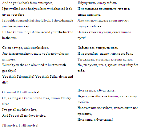 В данной курсовой работе анализируется оригинал и русскоязычный текст песни "I Will Survive". Эта песня уже в течении нескольких десятилетий является "гимном" всех брошенных одиноких девушек. Естественно, что раз это текст песни, то это художественный текст. В его переводе очень важно сохранить форму, а в данном случае еще и ритм. Необходимо так же донести до читателя и основную мысль песни – то, что девушку бросил любимый, но, тем не менее, она ищет в себе силы жить дальше. Мера переводимости текста увеличивается, за счет того, что эта проблема знакома многим девушкам вне зависимости от национальности, поэтому автору остается только подобрать подходящие средства выражения в русском языке.