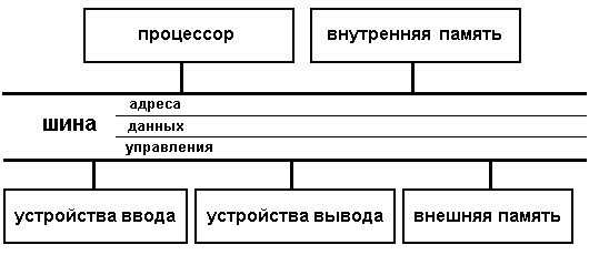 Несмотря на огромное разнообразие вычислительной техники и ее необычайно быстрое совершенствование, фундаментальные принципы устройства машин во многом остаются неизменными. В частности, начиная с самых первых поколений, любая ЭВМ состоит из следующих основных устройств: процессор, память (внутренняя и внешняя) и устройства ввода и вывода информации. Рассмотрим более подробно назначение каждого из них.