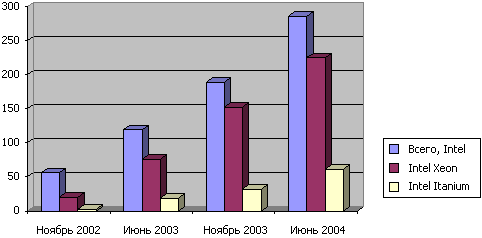 Если сопоставить последний список Top500 с опубликованным в июне 2003г., то обнаружится, что за истекший год количество систем на базе процессора Intel Xeon выросло почти в 3 раза (с 76 до 225 систем) и еще заметнее – более чем в 3 раза (с 19 до 61 системы) – увеличилось использование в суперкомпьютерах процессоров Intel Itanium2. Таким образом, более половины суперкомпьютеров (286 из 500) в последнем списке Top500 созданы на базе процессоров Intel, что красноречиво свидетельствует об ускоряющемся переходе от специализированного подхода к созданию суперкомпьютеров к методике, основанной на использовании стандартных готовых компонентов. Напомним, что три года назад в мировом рейтинге самых производительных компьютерных систем было всего 3 машины, созданные на основе продукции Intel.