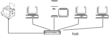 При физической звездообразной топологии [star topology] каждый сервер и рабочая станция подключаются к специальному устройству – центральному концентратору [hub], который осуществляет соединение пары узлов сети – коммутацию.