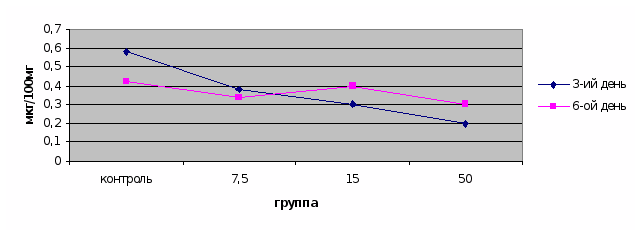 Содержание ТБК-продуктов выравнивается до нормальных значений во всех группах на шестой день. Наблюдавшееся понижение в первой половине недели находилось в прямой зависимости от дозы.