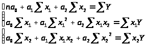 Коэффициенты Аn вычисляются при помощи систем нормальных уравнений. Например система нормальных уравнений для вычисления коэффициентов регрессии для уравнения линейной регрессии с двумя факторными признаками: