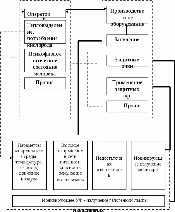 Люди, работающие в помещении, совместно с оборудованием, образуют систему «человек – машина - среда» («Ч-М-С»). Элементами этой системы являются: человек – производственный персонал; машина – все оборудование, а также осветительные и нагревательные приборы; среда – производственная среда в помещении, взаимосвязь в системе «Ч-М-С» представлена на рис.1. В системе «Ч-М-С» при определенных условиях могут возникать следующие опасности: Аномальный микроклимат, выполнение тяжелой умственной работы, информационная опасность, несоответствие показателей освещения характеристикам человека, пожароопасность, опасность поражения электрическим током, механические опасности, токсические химические вещества.