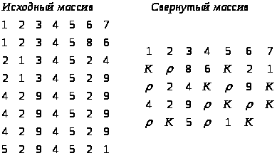 Например, если обозначить количество пропусков, соответственно, Х - 2; Y - 3; Z - 5, то исходный и свернутый массивы будут иметь вид: