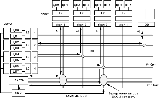 Архитектура коммутатора реализована с помощью аппаратной сети, которая осуществляет индивидуальные соединения типа точка-точка процессора с процессором, процессора с основной памятью и процессора с магистралью данных ввода/вывода. Эта сеть работает совместно с разделяемой адресной шиной. Такой сбалансированный подход позволяет использовать лучшие свойства каждого из этих методов организации соединений.