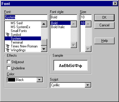 Рис.12: Диалог выбора шрифта позволяет Вам задать тип шрифта, размер, и цвет.