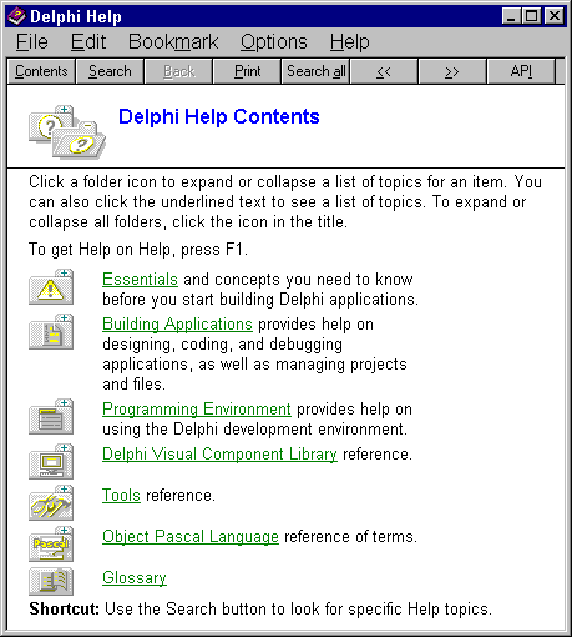 Справочник является контекстно-зависимым; при нажатии клавиши F1, Вы получите подсказку, соответствующую текущей ситуации. Например, находясь в Инспекторе Объектов, выберите какое-нибудь свойство и нажмите F1 - Вы получите справку о назначении данного свойства. Если в любой момент работы в среде Delphi возникает неясность или затруднение - жмите F1 и необходимая информация появится на экране.