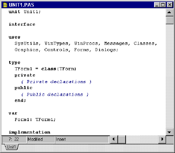 Программисты на Delphi проводят большинство времени переключаясь между Дизайнером Форм и Окном Редактора Исходного Текста (которое для краткости называют Редактор). Прежде чем Вы начнете, убедитесь, что можете распознать эти два важных элемента. Дизайнер Форм показан на рис.1, окно Редактора - на рис.2.