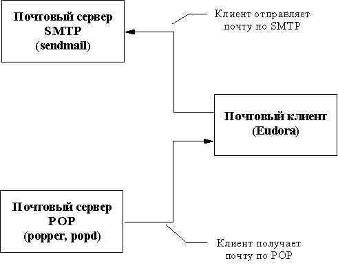Такая схема предполагает, что пользователь имеет почтовый ящик на машине-сервере, которая не выключается круглосуточно. Все почтовые сообщения складываются в этот почтовый ящик. По мере необходимости, пользователь из своего почтового клиента обращается к почтовому ящику и забирает из него пришедшую на его имя почту. При отправке программа-клиент обращается непосредственно к серверу рассылки почты и передает отправляемые сообщения на этот сервер для дальнейшей рассылки.