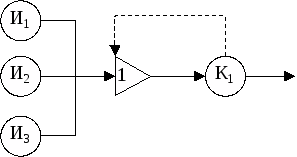 Источники И>1>, И>2,> И>3> имитируют поступление заявок от проектировщиков 1,2 и 3 соответственно. Канал К>1> имитирует процесс обработки заявок на центральной ЭВМ. Если канал К>1 >занят, то клапан 1 закрыт. Источники генерируют заявки, идущие затем на ЭВМ. Если ЭВМ занята, то заявка остается в источнике дожидаться своей очереди на обработку.